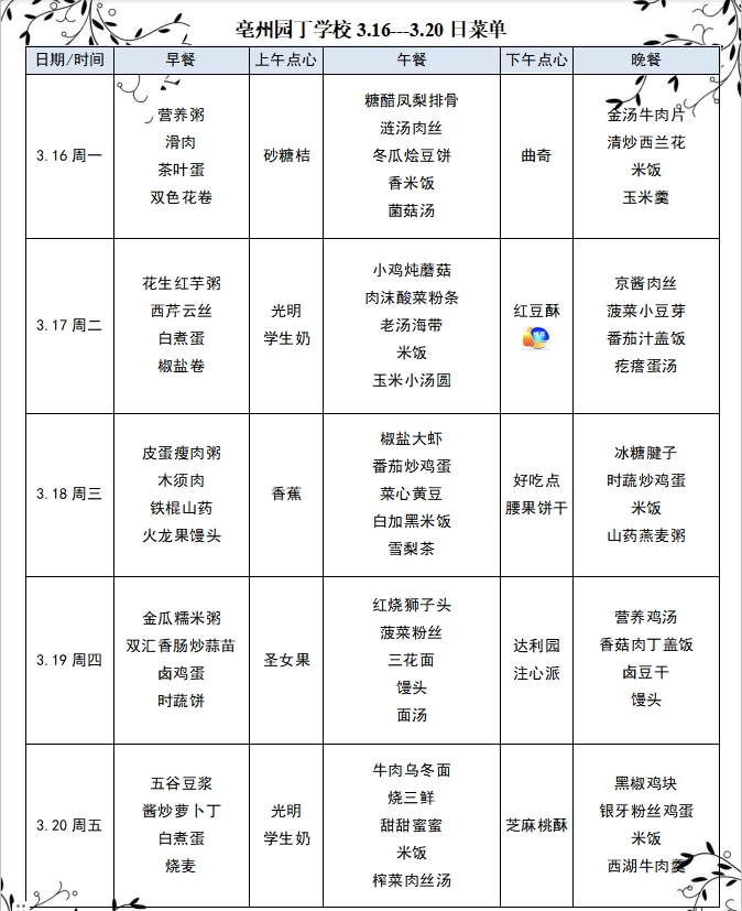 亳州園丁學(xué)校3.16---3.20日菜單