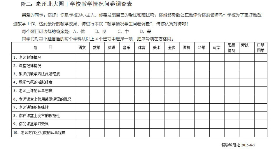 本次評選活動完全是學生自己做主,對自己所有任課教師從10個方面進行評價(具體見問卷調查表),學校建立了以校長袁芳為組長的評審小組。評審小組通過學生問卷調查和召開學生座談會等形式對所有任課教師進行全方位評價,根據(jù)評選結果最終確定出“學生最喜歡的老師”。