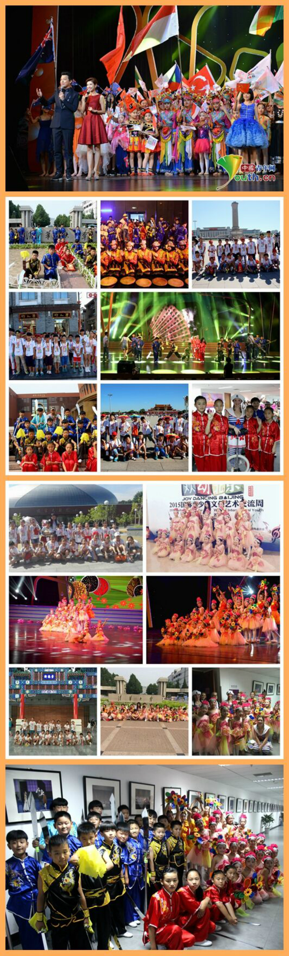 “歡樂舞動北京,青春擁抱世界?!辟裰荼贝髨@丁學校的同學們?nèi)缂s而至,不負期望!這次為期四天的北京之行在家長、孩子、老師的共同努力下,收獲的不僅僅是武術、舞蹈節(jié)目取得了各國觀眾的高度認可,更重要的是鍛煉了同學們獨立的生活能力,培養(yǎng)了同學們的集體團隊意識、時間觀念和吃苦耐勞的精神,同學們也不僅僅參觀了北京,而且走上了與國際接軌的大舞臺,為自己增添了一份精彩的舞臺經(jīng)驗同時更是豐富了自己的人生閱歷。