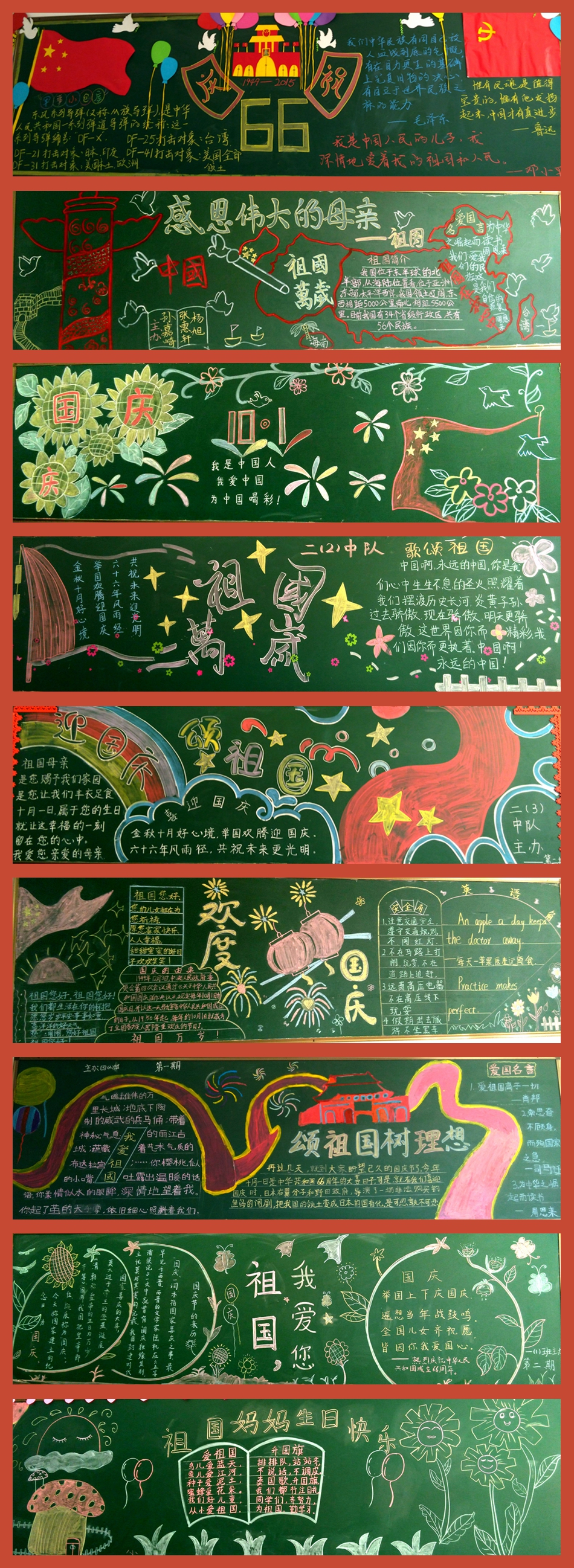 金秋十月,迎來了中華人民共和國66歲的生日。為了加強學生的愛國情感、增進班級文化建設(shè)、創(chuàng)建和諧校園,園丁學校精心組織制作了以“頌祖國 樹理想”為主題的黑板報評比活動。