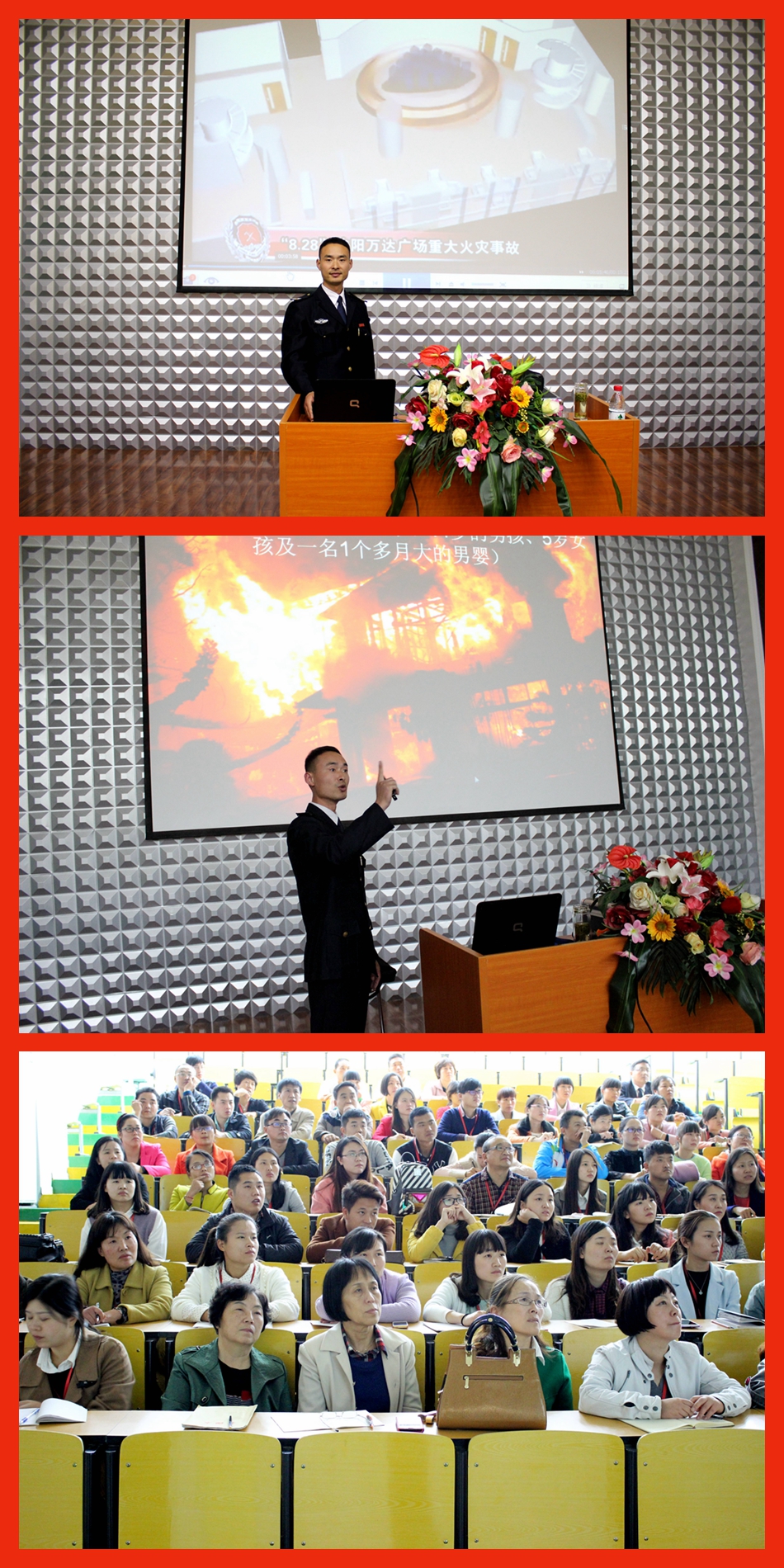 此次培訓會由安徽省合肥愛民防火中心的郭濤主任主講,他以現(xiàn)實生活中各個地區(qū)發(fā)生火災、爆炸的圖片、視頻、案例向我們論證了安全預防的重要性,并且為我們講解了如何做好安全預防工作。