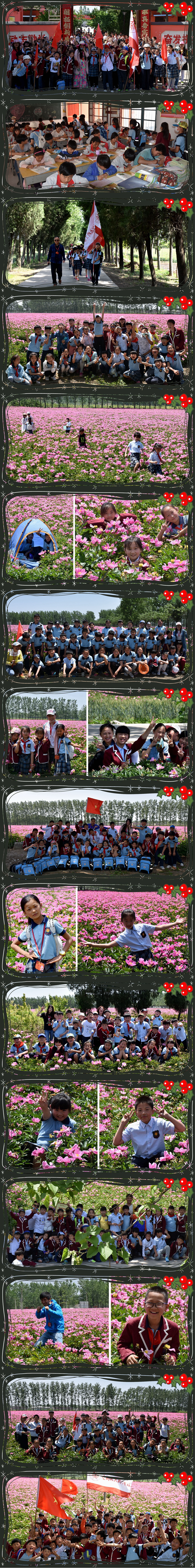 離開周老家小學,我們又步行至芍花盛開的大周萬畝芍花園,同學們個個精神抖擻、斗志昂揚,邁著整齊的步伐踏在鄉(xiāng)間的小路上,親近自然,擁抱自然,每個孩子的臉上都綻放著燦爛的笑容?!袄蠋?,前面一大片紅,是芍花嗎?”一個孩子驚叫了起來,這時孩子們的腳步突然間加快了,不一會兒,我們就置身于花的海洋。此時,就想起了清朝詩人劉開描寫芍花的詩句;“小黃城外芍藥花,十里五里生朝霞,花前花后皆人家,家家種花如桑麻。”