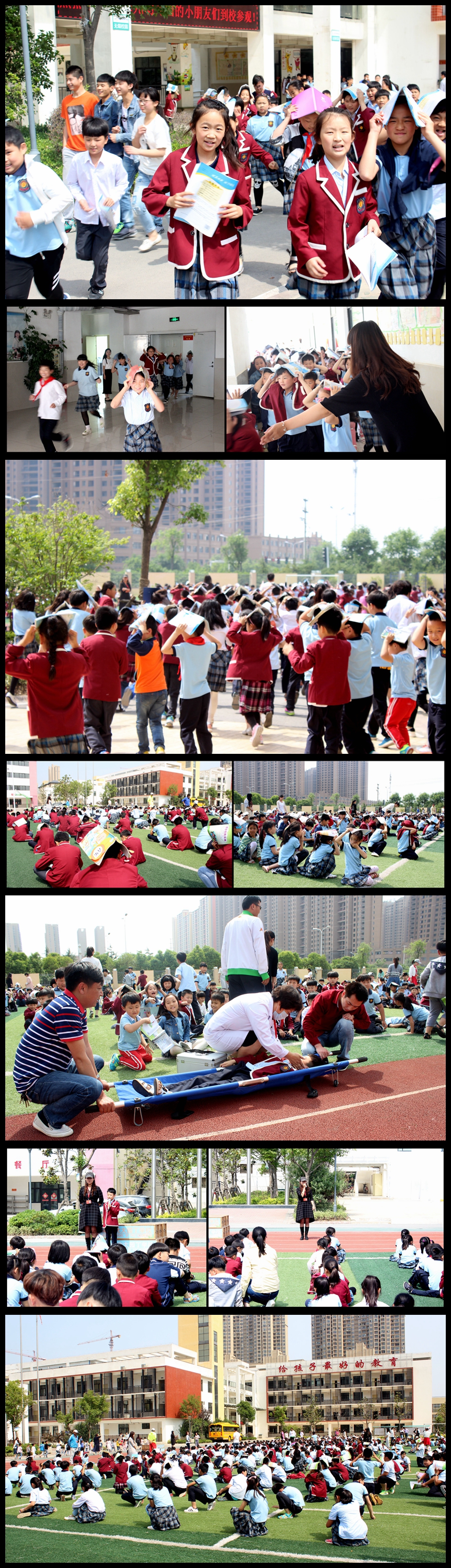 上午9:55分,響亮的防空警報聲突然響起,各班學生在老師的帶領下,拿書蓋在頭頂,迅速有序地從指定疏散通道撤離,在負責疏散的領導和老師的指揮下,全體師生迅速到達操場集合蹲下。醫(yī)療救護人員也及時到位。接著,各班主任清點本班人數(shù),并向袁校長匯報。整個過程歷時1分36秒。