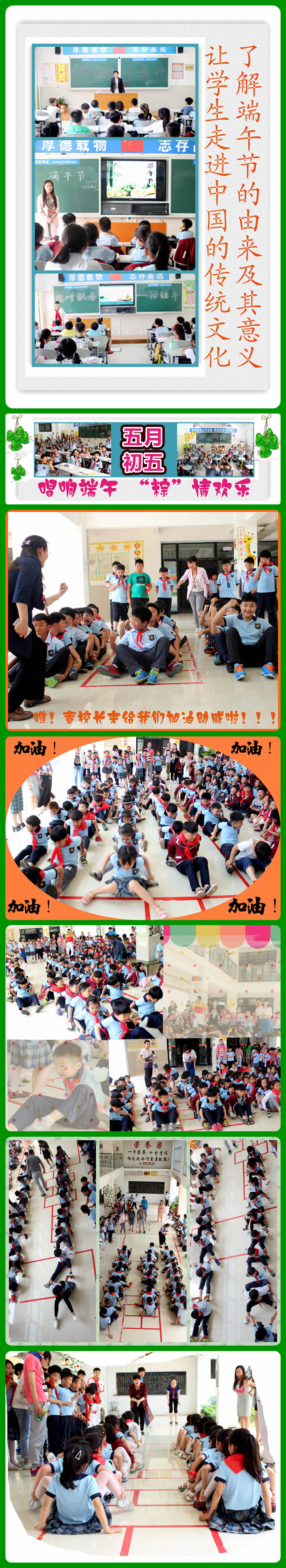 說起端午節(jié)的傳統(tǒng)習(xí)俗,那可少不了吃粽子、賽龍舟。6月7日、8日中午,激烈的“賽龍舟”比賽在我校舉行,此次比賽分為兩輪,以年級(jí)為單位進(jìn)行,每班選兩組參加,每組10人。賽前,孩子們認(rèn)真討論著應(yīng)賽策略,蓄勢(shì)待發(fā)。口號(hào)聲剛響起,各班的“小龍舟”啟動(dòng)了,數(shù)支隊(duì)伍,浩浩湯湯,氣勢(shì)磅礴。龍舟小健將們拼命向前,旁邊的拉拉隊(duì)奮力助威喝彩,加油聲簡(jiǎn)直震耳欲聾!場(chǎng)面熱鬧非凡!