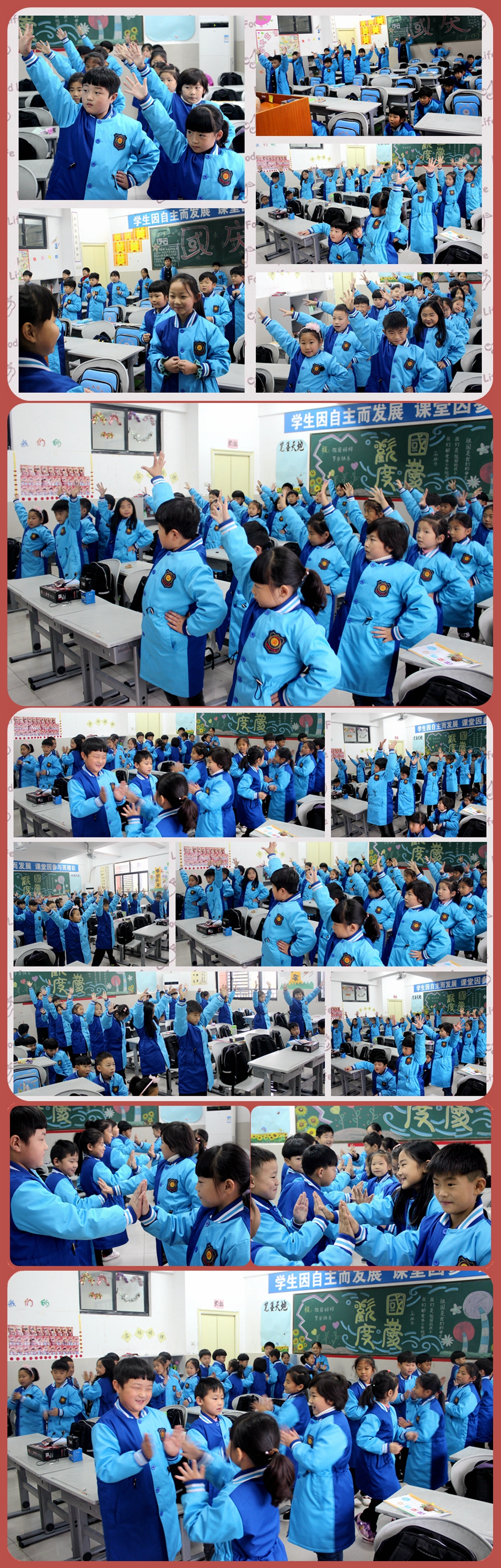穿新服、跳新操,雖然陰雨綿綿,但絲毫影響不了同學(xué)們的大課間活動(dòng),這不,老師們特意為孩子們編排出了一套獨(dú)具特色、快樂(lè)活潑的韻律操,深受全校師生的歡迎。屆時(shí)這套韻律操也將在運(yùn)動(dòng)會(huì)上大展風(fēng)采。大課間韻律操目的在于使德育、美育和體育有機(jī)融合,這種科學(xué)、快樂(lè)的體育鍛煉方式不僅增強(qiáng)了學(xué)生體質(zhì),培養(yǎng)了學(xué)生集體意識(shí)和組織紀(jì)律性,又豐富了學(xué)生的校園文化生活,成為學(xué)校又一特色。