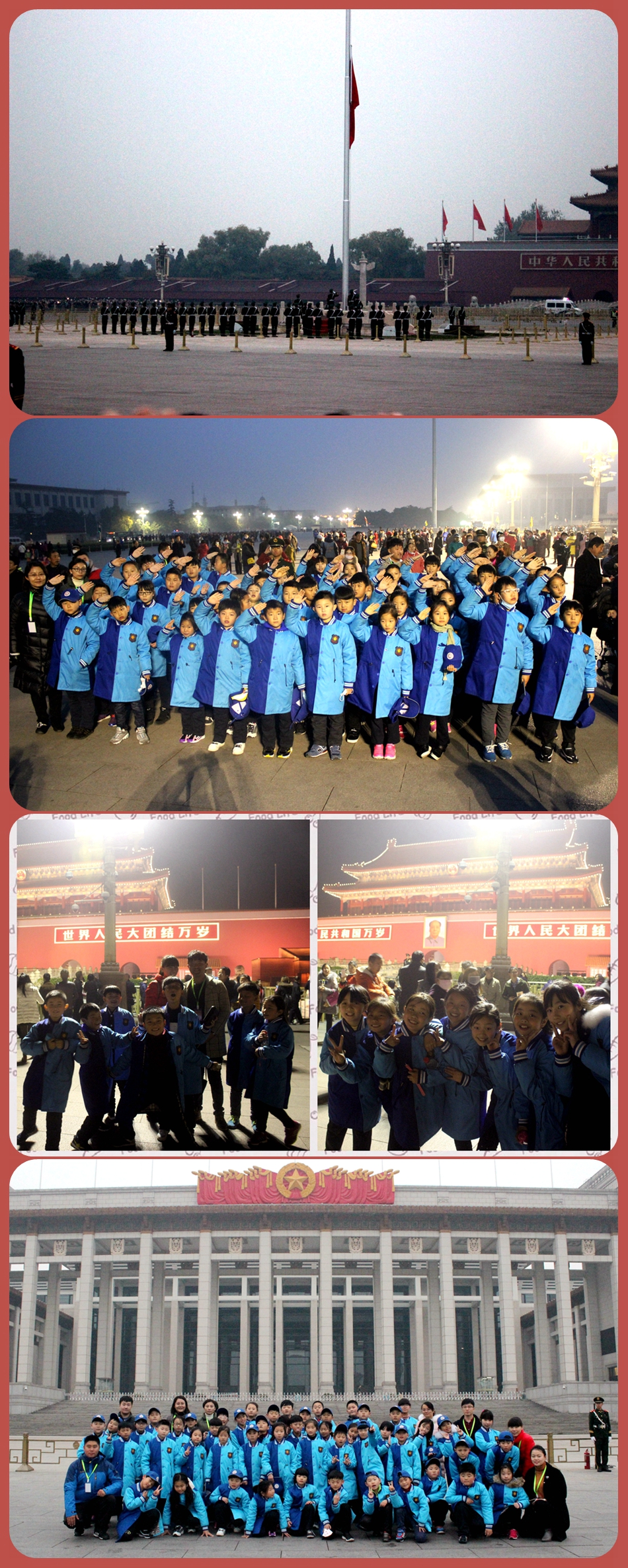 11月18日晨,迷迷糊糊的睡夢被叫醒,孩子們登上了開往天安門的大巴。晨曦中的天安門城樓還十分模糊,等待的人群一波又一波,排隊伍、過安檢,終于來到了莊嚴的天安門廣場!“看不見!看不見!”“姚明來了肯定能看見!”“看,執(zhí)勤的那個叔叔像個機器人!”孩子們小聲地嘀咕著。7:02國歌聲響起來了,我們的隊禮敬起來了,整整三遍國歌之后,國旗才穩(wěn)穩(wěn)地升到頂端。人群退去,我們才有機會走進升旗臺,“莊嚴”一詞再不僅僅是課本上的詞語,它有了畫面、有了參與、有了體驗、有了感受!“愛國”——我們可以這樣做!