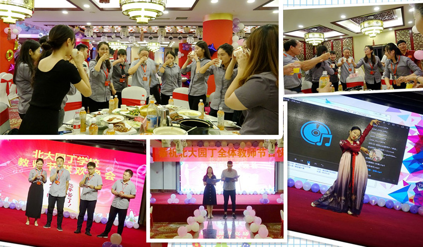 晚宴時分,全體教職工歡聚一堂,慶祝第35個教師節(jié)。宴會上,袁芳校長以一首原創(chuàng)詩開場,表達了對全體教職員工勤懇工作的認可與感激。聯(lián)歡晚會在黨員老師的一首詩朗誦中拉開帷幕,各個辦公室的才藝表演更是讓人眼前一亮:舞蹈、合唱、朗誦、配音劇、歌舞串燒、器樂表演、T臺秀、幸運抽獎、生日頒獎……節(jié)目形式多樣,內(nèi)容豐富。詹副校長宣讀的對畢業(yè)班老師的表彰決定更是將晚會氣氛推向了高潮。