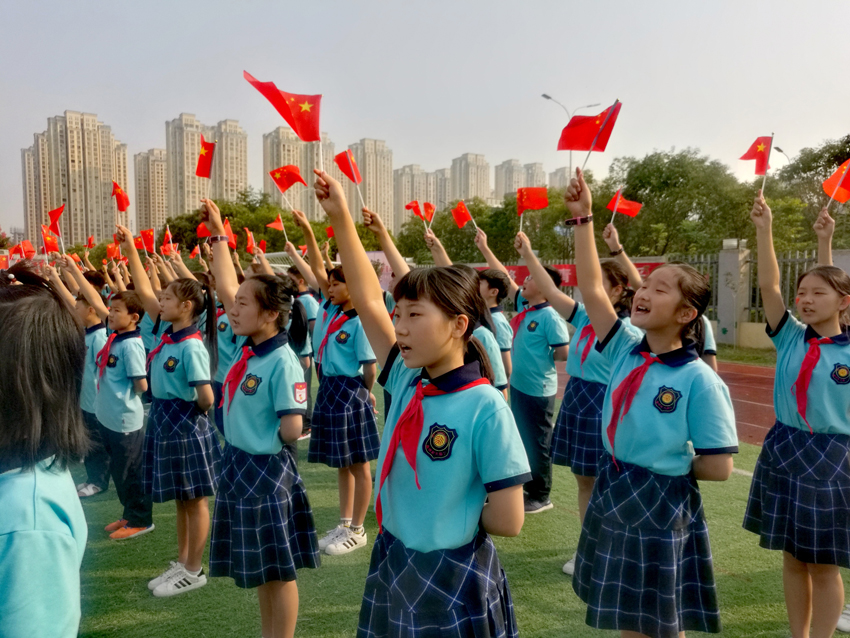 歌聲嘹亮,紅旗飛揚(yáng),隨著音樂(lè)接近尾聲,巨幅國(guó)旗緩緩從教學(xué)樓頂樓展開(kāi),北大園丁學(xué)子面向鮮艷的五星紅旗行少先隊(duì)隊(duì)禮,千人一心齊聲高呼“祝我們偉大的祖國(guó),繁榮昌盛,國(guó)泰民安!”