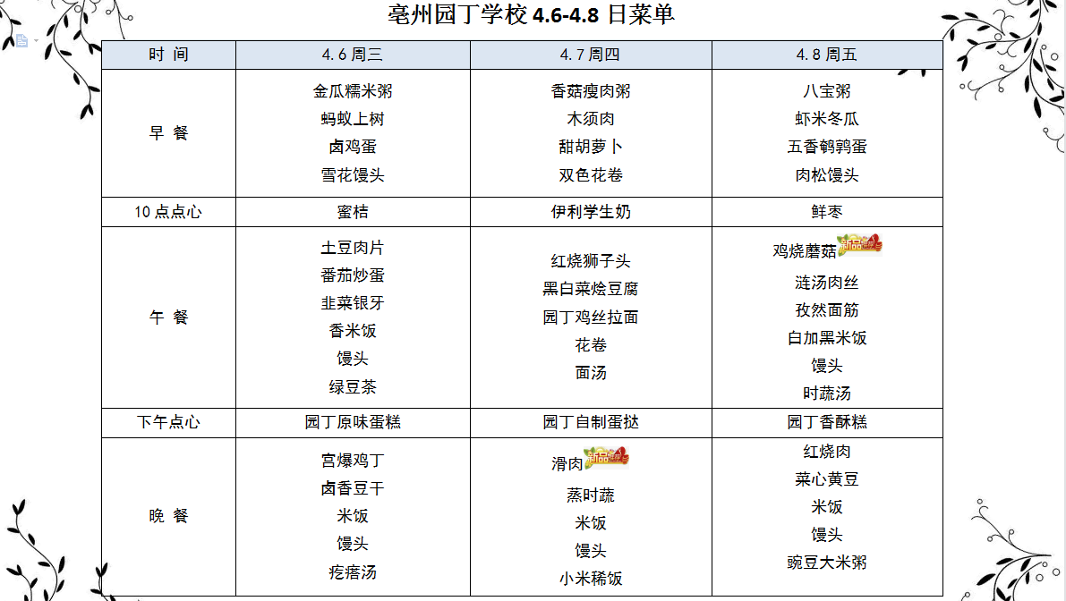 亳州園丁學(xué)校4.6-4.8日菜單
