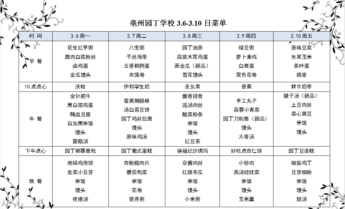 亳州園丁學(xué)校3.6-3.10日菜單