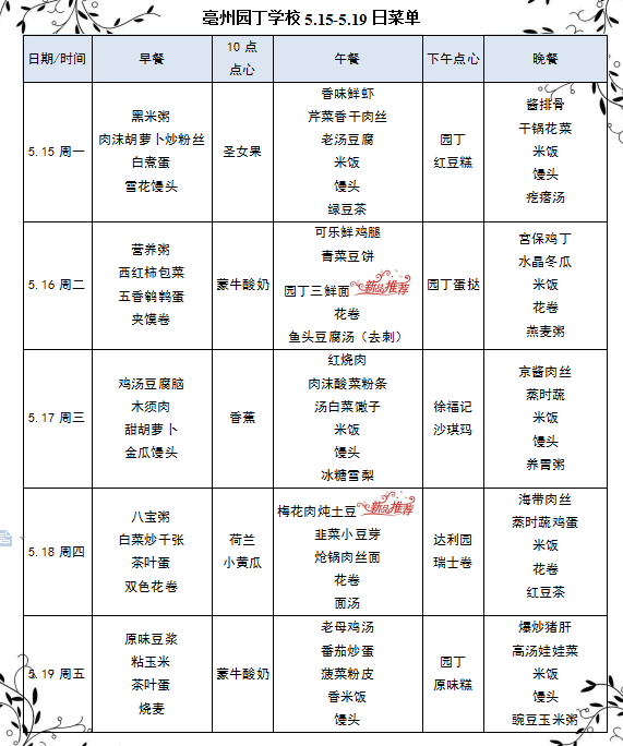 亳州園丁學(xué)校5.15-5.19日菜單