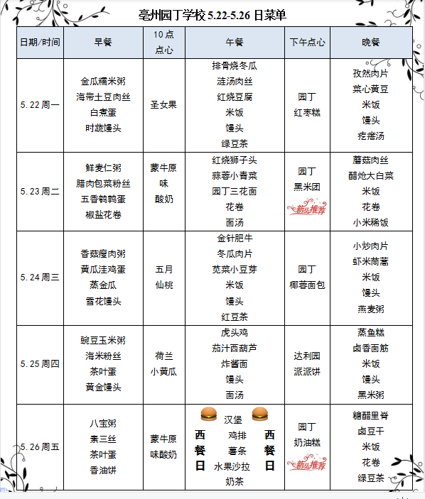 亳州園丁學(xué)校5.22-5.26日菜單