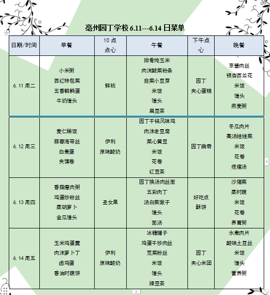 亳州園丁學(xué)校6.11-6.14日菜單