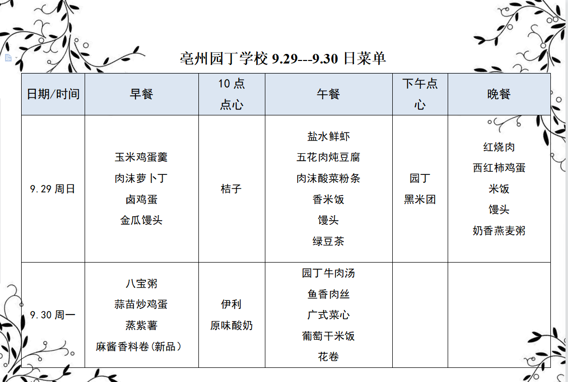 亳州園丁學(xué)校9.29-9.30日菜單