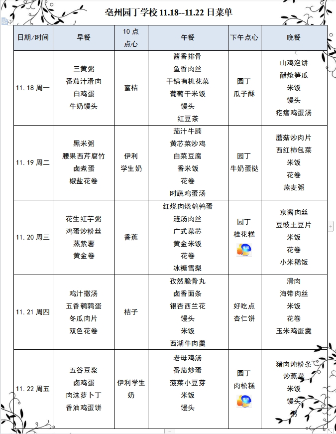 亳州園丁學(xué)校11.18--11.22日菜單