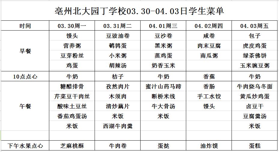 亳州園丁學校3.4--3.6日菜單