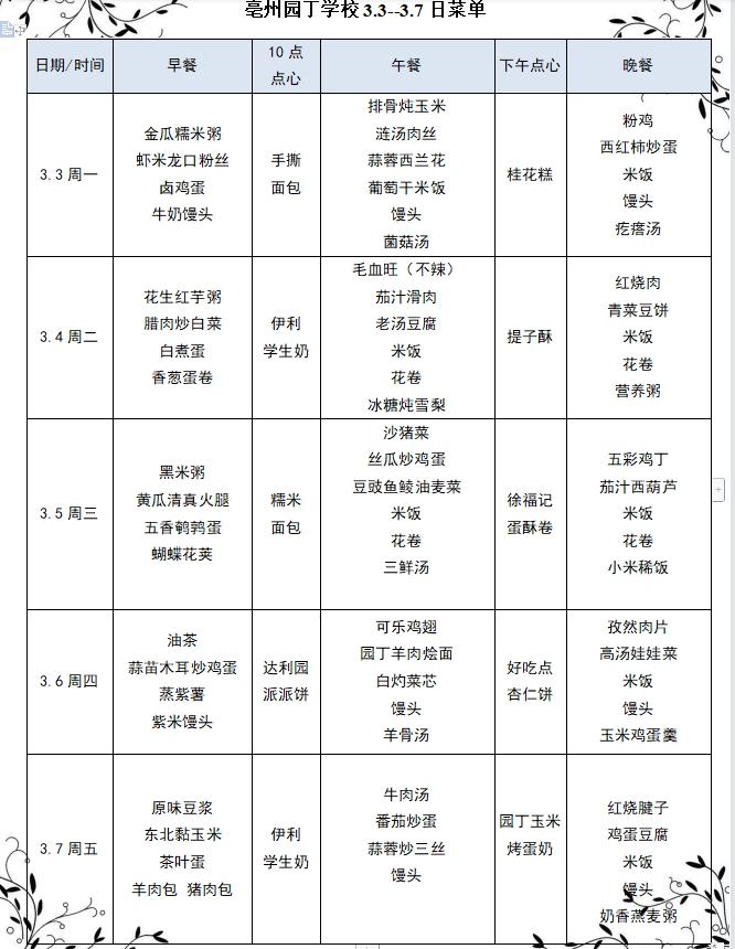 亳州園丁學(xué)校3.3--3.7日菜單
