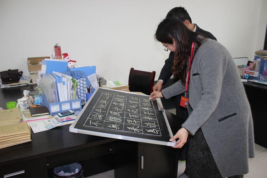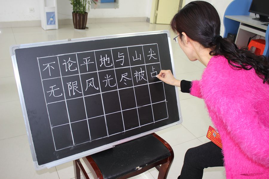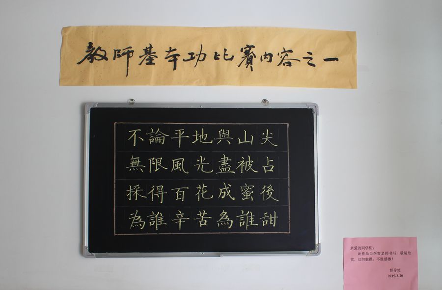 為了提高我校教師的基本素質(zhì),使教師的粉筆字練習(xí)扎實(shí)有效,學(xué)校做了大量工作,不僅為每位教師發(fā)放了一塊小黑板,還經(jīng)常組織粉筆字培訓(xùn)課程。教師們練習(xí)書寫的積極性非常高,尤其是學(xué)校發(fā)布了粉筆字大賽的通知以后,教師中掀起了大練基本功的熱潮。為了寫好粉筆字,教師們經(jīng)?;ハ嘌芯棵總€(gè)字的基本筆畫和間架結(jié)構(gòu),并反復(fù)練習(xí),直到自己滿意為止。(真 言)