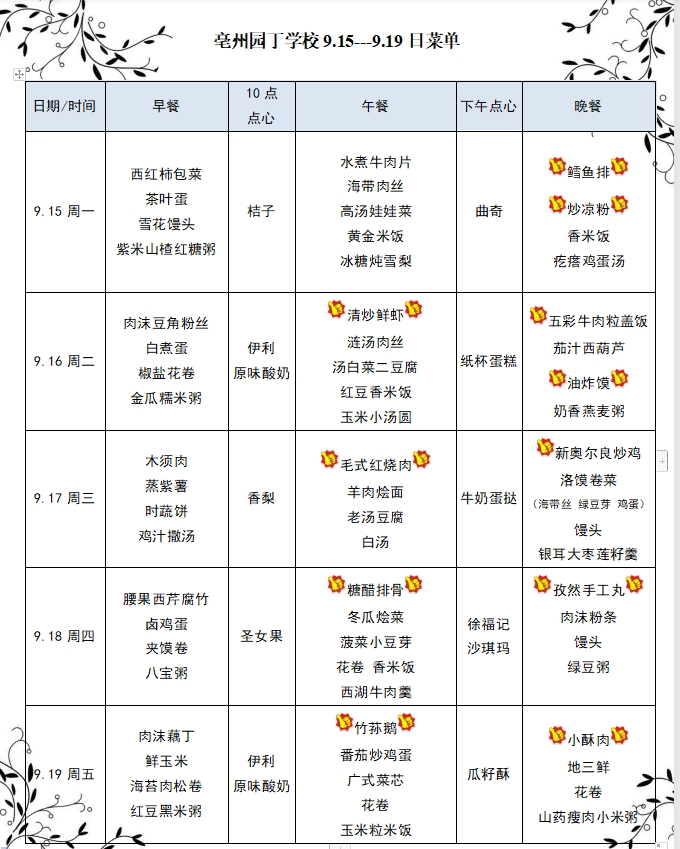 亳州園丁學校9.15---9.19日菜單
