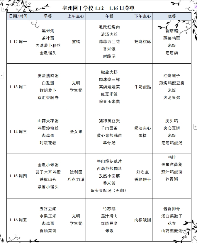 亳州園丁學(xué)校1.12---1.16日菜單