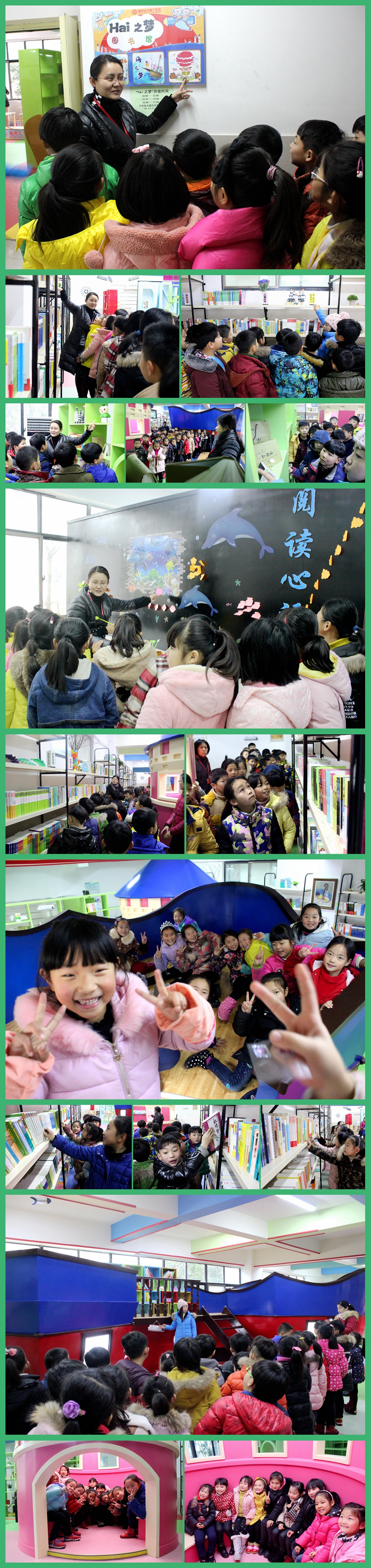 首先映入我們眼簾的是圖書館門前的門牌——“hai之夢”,這個“hai之夢”可是有三層含義的:嗨之夢;海之夢;孩之夢。除了含義豐富之外,門牌設計也是非常夢幻的,讓人還沒進入圖書館就已經(jīng)有了一種遨游在童話海洋中的感覺,推門進入,還真的是大開眼界!能夠滿足女孩子們公主夢幻的粉色“my城堡”、代表男孩子們征服海洋夢想的“our遠航號”以及科技時代的電子閱讀區(qū)無一不吸引著孩子們的眼球。光看我們可不能滿足,于是此次學生參觀時還伴隨著我們袁校長、牛主任以及張盼老師的詳細講解,孩子們邊聽邊看,興奮和喜悅溢于言表,直高喊道:“我今天都不想回家了!我想在這里看書!我想睡在這里!”