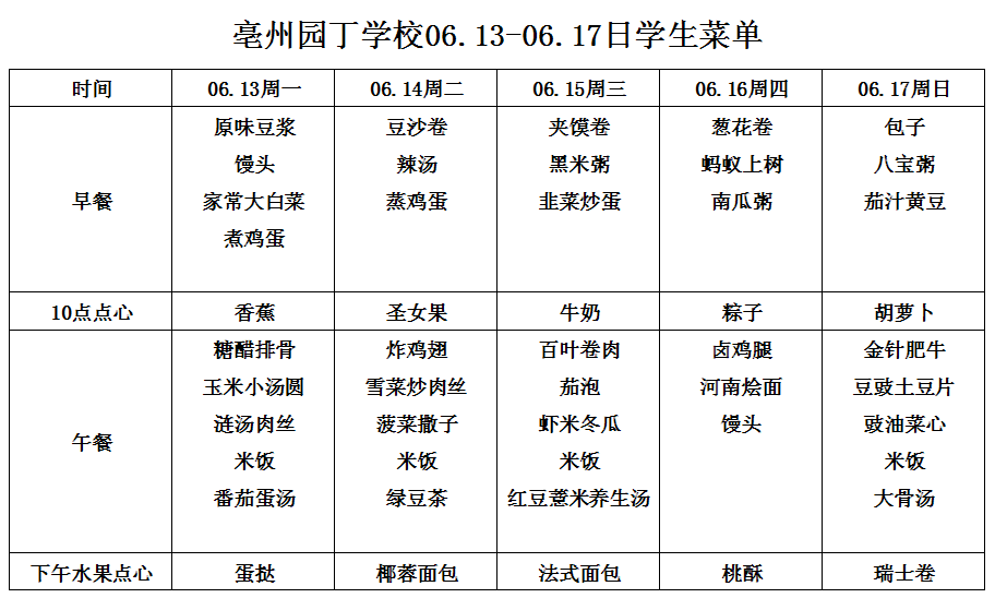 亳州園丁學校3.9---3.13日菜單