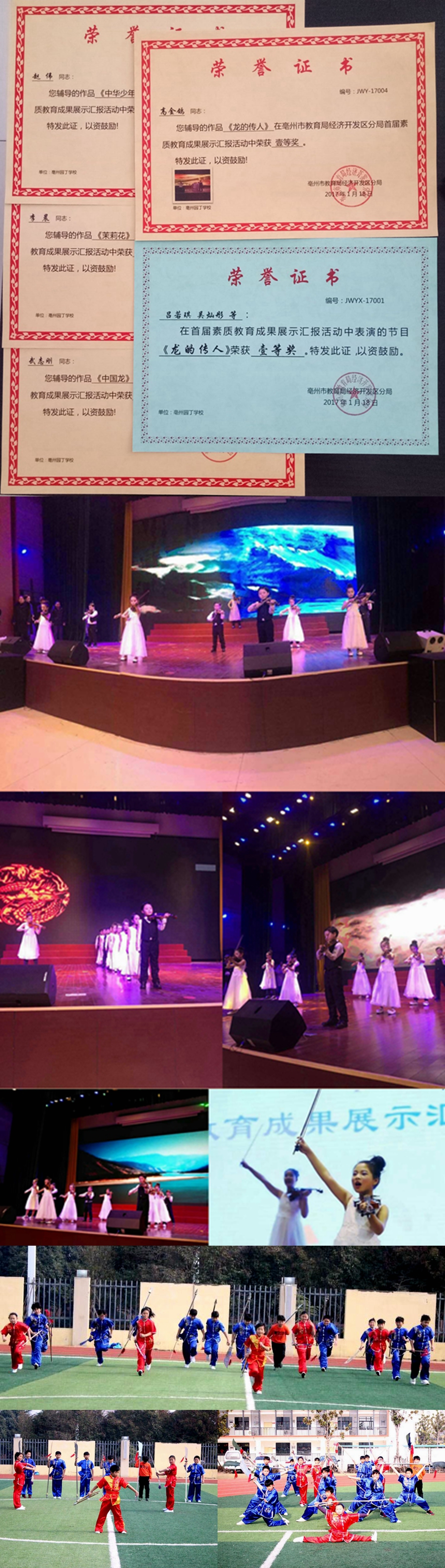 最終,高金鴿老師輔導(dǎo)的小提琴協(xié)奏《龍的傳人》榮獲一等獎(jiǎng);其中呂若琪和吳燦彤等同學(xué)以微妙傳神的演奏獲得表演一等獎(jiǎng)!另,武志剛老師輔導(dǎo)的武術(shù)《中國(guó)龍》、趙偉老師編導(dǎo)的詩(shī)朗誦《中華少年》以及李晨老師輔導(dǎo)的舞蹈《茉莉花》均榮獲三等獎(jiǎng)。恭喜他們,他們是我們園丁人的驕傲!