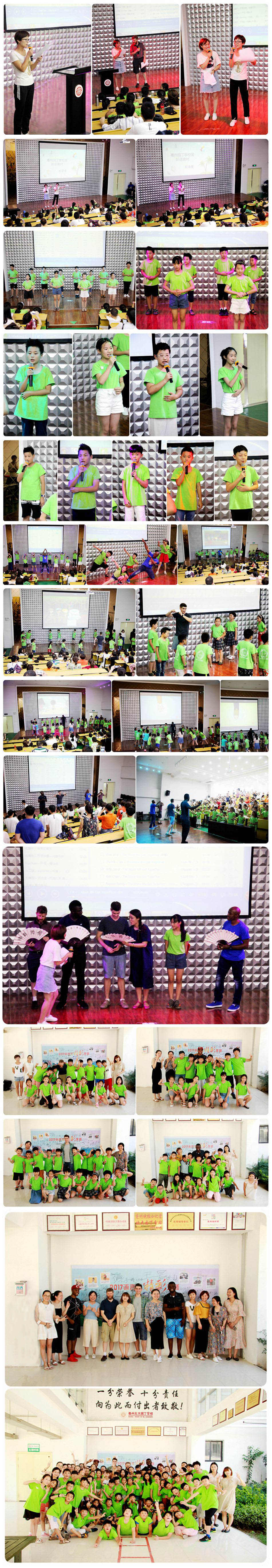 一個(gè)星期前,我們?cè)跔N爛的朝陽中,迎來了語言村的開幕。今天,懷著濃濃的不舍,帶著滿滿的收獲,我們的語言村夏令營圓滿結(jié)束了。一個(gè)星期,時(shí)光太匆匆,有太多的回憶,這一張張照片,注定2017的這個(gè)夏天難忘和感動(dòng)。這里離不開老師們的辛苦付出,也離不開家長們的大力支持。下午4:00我們?cè)趫?bào)告廳舉行了隆重的閉營儀式,外教和孩子們進(jìn)行了精彩的表演。七天相處結(jié)束了,這里有太多的感動(dòng)和依戀,也有依依不舍的淚水,更多的是相互的牽掛和真誠的祝福。快樂的時(shí)光總是那么匆匆,滿懷希望而來,滿載收獲而歸。傷離別,離別總是在眼前;說再見,再見不會(huì)太遙遠(yuǎn);若有緣,有緣就能期待明天;你和我,重逢在明年的語言村。