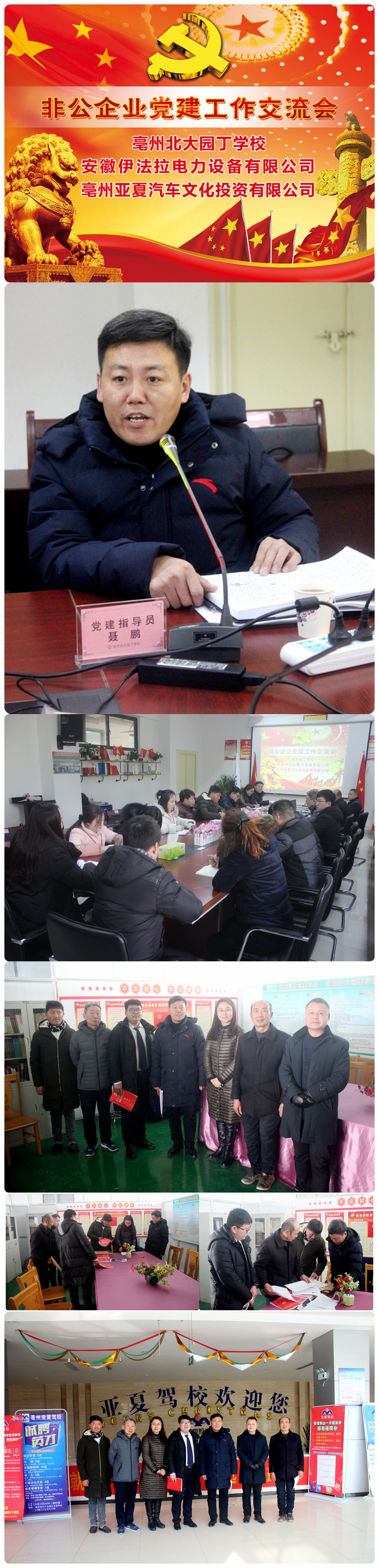 2018年1月30日,在黨建指導(dǎo)員聶鵬同志和亳州學(xué)院組織部范科長(zhǎng)的帶領(lǐng)下,亳州北大園丁學(xué)校黨支部支委成員、亞夏集團(tuán)皖北支部支委成員、伊法拉電力設(shè)備有限公司黨支部支委成員一行人分別蒞臨三家單位參觀學(xué)習(xí)黨建工作。