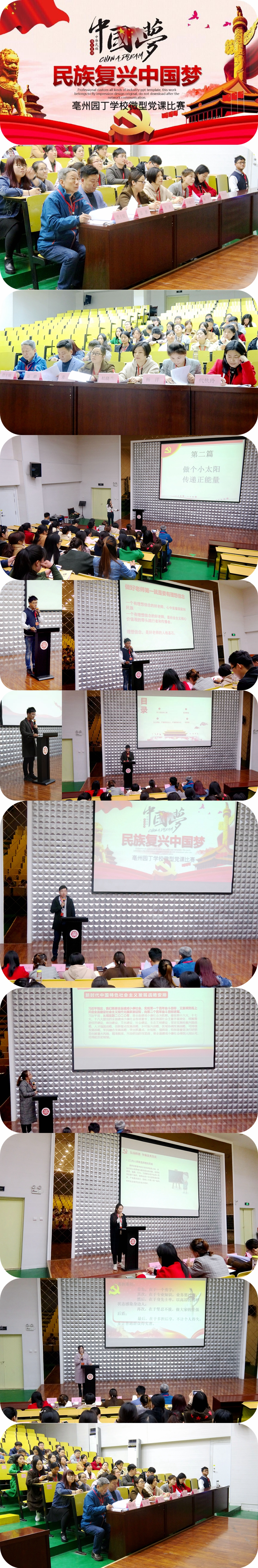 為深入學(xué)習(xí)十九大精神內(nèi)涵,強化習(xí)近平總書記系列重要講話、黨章黨規(guī)的學(xué)習(xí),深化黨員教育效果,4月13日下午,我校在多媒體報告廳成功舉辦了“首屆微型黨課比賽”。全校全體黨員教師參加了此次比賽,黨建指導(dǎo)員、亳州學(xué)院組織部聶鵬老師、我校黨支部組織委員兼副校長詹士銳同志以及各學(xué)科教研組長擔(dān)任此次大賽評委。